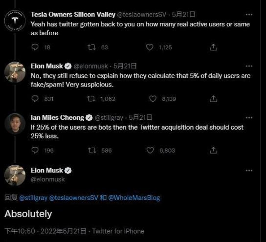 美國當(dāng)?shù)貢r(shí)間周六,推特用戶 Ian Miles Cheong 發(fā)推文,談及馬斯克可能降低收購?fù)铺爻鰞r(jià)的想法,他寫道:“如果 25% 的推特用戶是機(jī)器人,那么收購?fù)铺氐慕灰壮杀疽矐?yīng)該降低 25%。”馬斯克對此給出肯定回復(fù)。