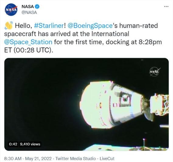 美國國家航空航天局(NASA)官方推特 5 月 20 日發(fā)布消息稱,波音公司星際客船(Starliner)于美國東部時間 20 日 20:28(北京時間 5 月 21 日8:28)與國際空間站對接。