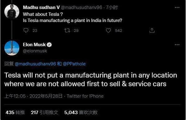 周五當(dāng)天,有粉絲在推特上詢問特斯拉在印度建廠的最新情況,馬斯克回應(yīng)道:“只有首先被允許銷售和維修汽車,特斯拉才會(huì)考慮在印度建立制造廠。”