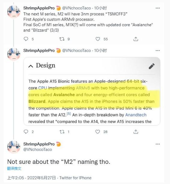 他表示,下一款 M 系列芯片 ——M2(未定名)將基于 3nm 工藝(TSMCFF3)打造,而且是 Apple 定制的 Arm v9 架構處理器(目前的 A15 是 Arm v8)。此前,蘋果 M1 系列的終極 SoC——M1X (未定名) 將配備更新的核心“雪崩”和“暴雪”。