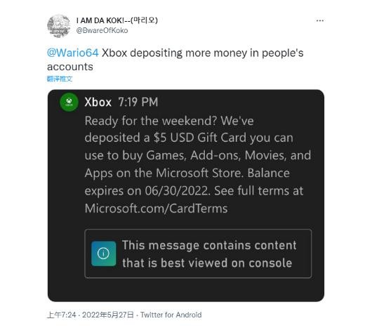 根據(jù)玩家從 Xbox 上收到的消息,這些 5 美元的禮品卡將持續(xù)到 6 月 30 日,但這條消息不太容易被發(fā)覺到。