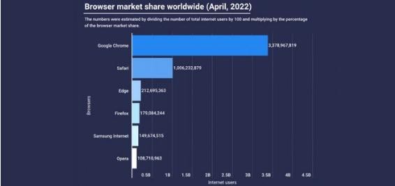 雖然 Safari 擁有超過(guò) 10 億用戶,但谷歌 Chrome 的用戶數(shù)量是其三倍,總用戶量為 3,378,967,819。
