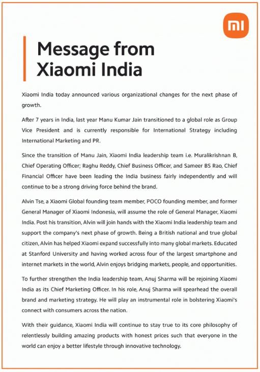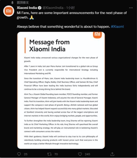 小米印度公司通過(guò)推特宣布公司組織調(diào)整:馬努?庫(kù)馬爾?賈恩(Manu Kumar Jain)去年以集團(tuán)副總裁的身份轉(zhuǎn)為全球角色,目前負(fù)責(zé)包括國(guó)際營(yíng)銷(xiāo)和公關(guān)在內(nèi)的國(guó)際戰(zhàn)略;小米印尼公司前總經(jīng)理謝子陽(yáng)(Alvin Tse)將擔(dān)任小米印度公司總經(jīng)理一職;阿努吉?夏爾馬(Anuj Sharma)將重新加入小米印度,擔(dān)任其首席營(yíng)銷(xiāo)官。