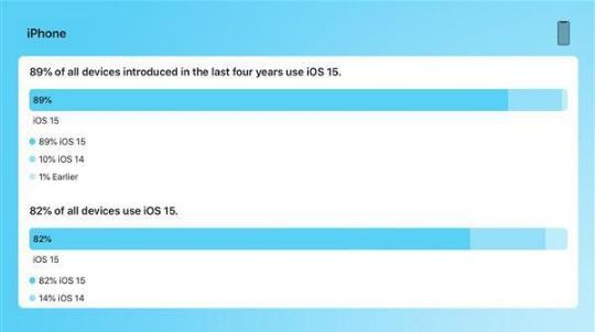 為了迎接即將到來的 iOS 16,蘋果更新了 iOS 15 普及率數(shù)據(jù),上次更新還是今年 1 月。5 個(gè)月過去了,在過去四年推出的設(shè)備中,iOS 15 的普及率達(dá) 89%,iOS 14 的普及率仍然有 10%,1% 為較早版本。