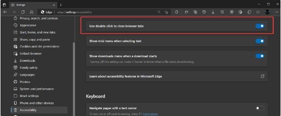 IT之家了解到,該功能默認(rèn)情況下是禁用的,因此需要導(dǎo)航到 Edge 設(shè)置 > 輔助功能并打開“使用雙擊關(guān)閉瀏覽器標(biāo)簽頁”選項(xiàng)。然后,用鼠標(biāo)左鍵雙擊一個標(biāo)簽頁,就可以將其關(guān)閉。