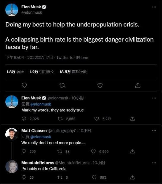 他在推特上寫道:“ 我正在盡最大努力幫助解決人口危機(jī)。出生率下降是人類文明目前面臨的最大危險(xiǎn)。”