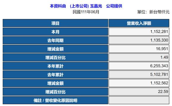 7 月 7 日,玉晶光披露了公司 2022 年 6 月的營收情況。公告顯示,玉晶光當(dāng)月實(shí)現(xiàn)營收 11.52 億元新臺幣,月增 42.53%,年增 1.49%;該公司上半年實(shí)現(xiàn)營收合計 62.55 億元新臺幣,與去年同期相比增長 22.59%。