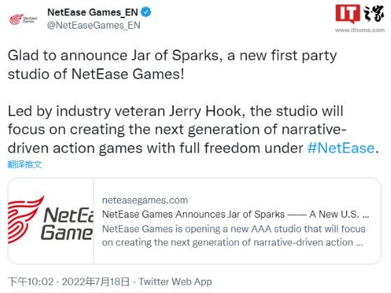 網(wǎng)易網(wǎng)絡(luò)游戲部門網(wǎng)易游戲宣布,正在開設(shè)一個(gè)新的 AAA 工作室 Jar of Sparks,將專注于創(chuàng)造下一代敘事驅(qū)動(dòng)的動(dòng)作游戲。