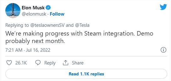 馬斯克稱整合Steam的工作取得進展 下個月或會演示 10:58:28