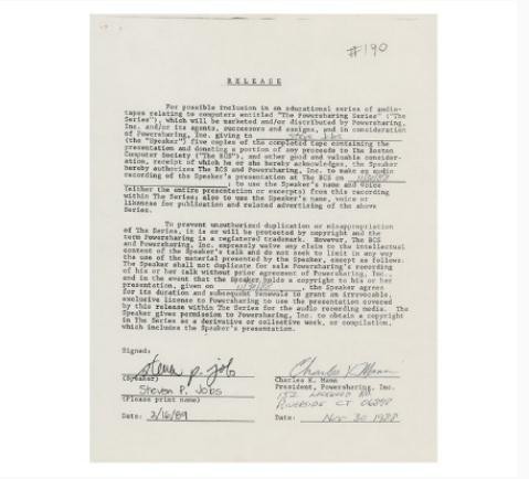 拍品還包括了當(dāng)年喬布斯為 Powersharing 系列和早期 NeXT 計(jì)算機(jī)會(huì)議錄制的音頻,還包括計(jì)算機(jī)手冊(cè)和 Apple Newton MessagePad 等物品,但其中更獨(dú)特的是由喬布斯、Apple 聯(lián)合創(chuàng)始人 Steve Wozniak(史蒂夫·沃茲尼亞克)和許多其他人簽名的一系列文件、新聞稿等。這些文件包括參與 Powersharing 系列期間,眾多技術(shù)先驅(qū)簽署發(fā)布的表格包括比爾·蓋茨、埃斯特·戴森、皮克斯聯(lián)合創(chuàng)始人阿爾維·雷·史密斯、蘋(píng)果前首席執(zhí)行官約翰·斯卡利等。