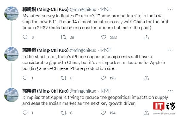 天風國際分析師郭明錤今日在推特爆料,根據(jù)他最新調(diào)查顯示,蘋果最大的供應商富士康在印度的 iPhone 生產(chǎn)基地或?qū)⒃?2022 年下半年中(2H22),首次與中國同時出貨新款的 6.1 英寸 iPhone 14。而在此前,印度通常會比中國晚一個季度出貨。