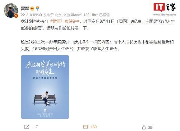 雷軍通過社交媒體表示 年度演講主題是“穿越人生低谷的感悟” 10:08:01