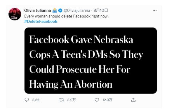 此前,F(xiàn)acebook 因其向內(nèi)布拉斯加州警方提供了墮胎當事人的臉書消息和相關活動,遭到了網(wǎng)友的強烈反對,#刪除臉書#(DeleteFacebook)這一話題登上了事發(fā)當日的美國推特熱榜。