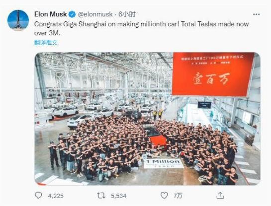 馬斯克在推特上寫道:“祝賀上海工廠生產(chǎn)了 100 萬輛電動(dòng)汽車!特斯拉現(xiàn)在總產(chǎn)量已經(jīng)超過 300 萬輛。”