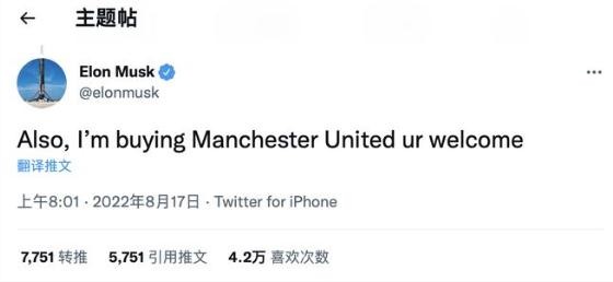 最近曼聯(lián)的流量實(shí)在太大,連特斯拉 CEO 馬斯克也橫插一腳。8 月 17 日,特斯拉 CEO 馬斯克在推特發(fā)文稱,將收購英超俱樂部曼聯(lián)。