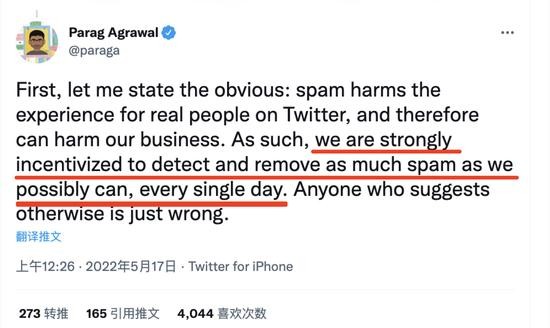 此外,推特還將增加用戶數(shù)量的任務置于減少虛假賬戶數(shù)量之上,并用高達 1000 萬美元的獎金激勵高管增加用戶數(shù)量。而此前 5 月,推特 CEO Parag Agrawal 信誓旦旦地表示,“公司有強烈的意愿刪除盡可能多的虛假賬戶”。