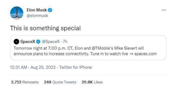 SpaceX和T-Mobile聯(lián)合舉辦活動 宣布所謂的“增強連接”計劃 09:43:37