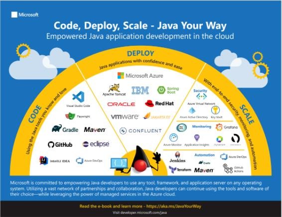Azure 的多項基礎(chǔ)設(shè)施是與 Java 生態(tài)系統(tǒng)中的主要供應商合作建立,如與 Pivotal / VMWare 聯(lián)合開發(fā)的 Azure Spring Apps,其他像 Azure App Service 上的 Red Hat JBoss EAP、WebSphere Application Server、WebSphere Liberty 和 Azure 上的 Open Liberty、Azure VM 上的 Oracle WebLogic Server 和 Azure Kubernetes Service 和 Apache Kafka for Confluent Cloud 等。 Azure 還可以與 Maven、Gradle、Eclipse Toolkit 等?具?縫協(xié)作。