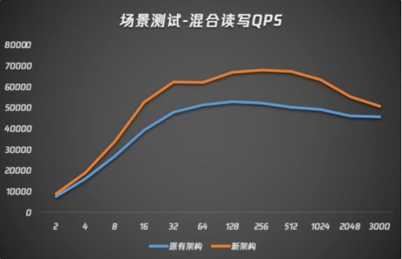在只寫(xiě)場(chǎng)景下,搭載了新一代內(nèi)核的騰訊云數(shù)據(jù)庫(kù) MySQL 性能隨線程數(shù)增加而始終高于上一代版本,線程數(shù)為 256 時(shí)達(dá)到最高 QPS,且在線程數(shù)為 512 時(shí),在新內(nèi)核加持下 QPS 達(dá)到超過(guò) 20% 的提升。