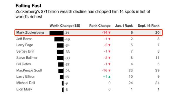 盡管幾乎所有美國(guó)科技巨頭都經(jīng)歷了艱難的一年,但是扎克伯格的財(cái)富大縮水依然引人注目。今年到目前為止,他的財(cái)富縮水了一半還多,達(dá)到了 710 億美元 (約合 4975 億元人民幣),是彭博億萬(wàn)富翁指數(shù)追蹤的超級(jí)富豪中損失最多的。他目前的凈資產(chǎn)為 559 億美元,在全球億萬(wàn)富翁中的排名從年初的第第 6 下滑至第 20 位,這是他自 2014 年以來(lái)的最低排名,處于三個(gè)沃爾頓家族和兩個(gè)科赫家族成員之后。