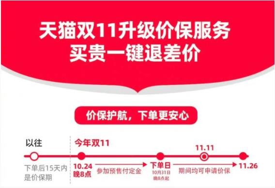 據(jù)淘寶最新消息,為了更好地保護(hù)消費者權(quán)益,今年天貓雙十一對價保規(guī)則做了升級,將原來的付款后 15 天內(nèi)價保,改為 11 月 11 日活動結(jié)束后 15 天內(nèi)全程價保,最長價保時間可以延長至 27 天。如果小伙伴們發(fā)現(xiàn),此前購買帶價保標(biāo)識的產(chǎn)品出現(xiàn)降價,都可以直接發(fā)起價保申請。