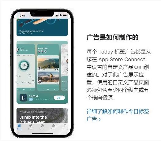 “有了 Today 標(biāo)簽廣告,你的 App 就可以出現(xiàn)在 App Store 首頁的顯著位置 —— 從而讓它成為用戶打開 App Store 時(shí)最先看到的內(nèi)容之一,”蘋果寫道。