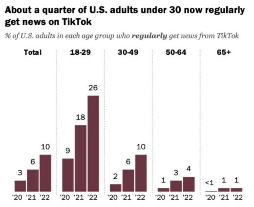 調(diào)查顯示,自 2020 年以來(lái),從 TikTok 獲取新聞的美國(guó)人比例增加了兩倍。目前,大約 10% 的美國(guó)成年人經(jīng)常通過(guò)該應(yīng)用獲取新聞。在 30 歲以下的成年人中,這一比例躍升至 26%。