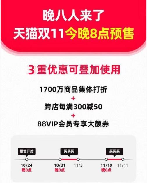 據(jù)介紹,今年雙 11,消費者可以將三重優(yōu)惠疊加使用:1700 萬商品集體打折、全場跨店每滿 300 減 50、88VIP 會員再領(lǐng) 820 元大額券。