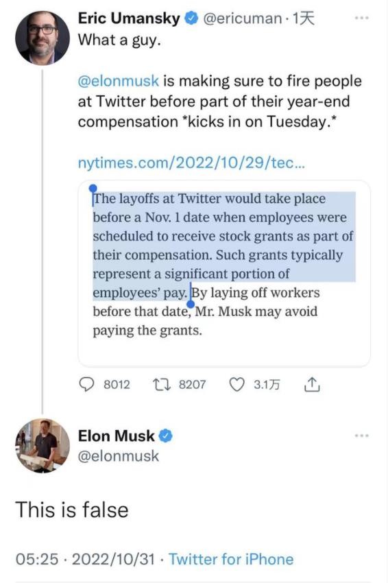 周日有推特用戶向馬斯克求證,是否決定要在本周二向一些推特員工發(fā)放部分年終獎前進(jìn)行裁員。馬斯克回應(yīng)稱:“這是假的。”