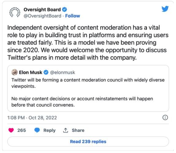 目前馬斯克還沒有透露推特內(nèi)容審核委員會如何組建的相關信息。未來推特是否會顯著改變內(nèi)容審核政策,恢復特朗普等爭議賬號,將直接取決于這些委員的立場與背景。顯然,這個委員會的人員組成將成為美國社會左右兩派的關注焦點。有趣的是,F(xiàn)acebook 內(nèi)容審核委員會也轉(zhuǎn)發(fā)了馬斯克的推文,歡迎推特也借鑒他們的模式。