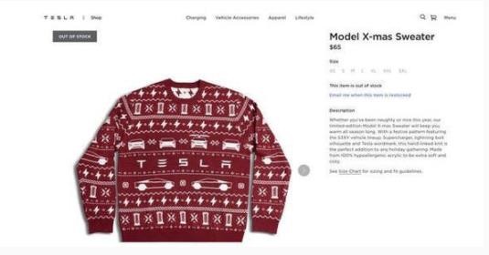 因為相關節(jié)日的即將來臨,特斯拉這家全球范圍內(nèi)最大的電池汽車公司,居然在自己的海外官方網(wǎng)站上上線了一款圣誕毛衣。而且,這款產(chǎn)品似乎還非常合大部分消費者的心意,開售一分鐘便成功售罄,目前已經(jīng)處于缺貨狀態(tài)。