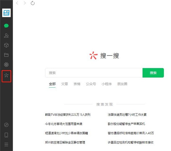 1.電腦打開(kāi)微信面板,點(diǎn)擊左側(cè)的搜一搜圖標(biāo)進(jìn)入搜一搜的頁(yè)面。