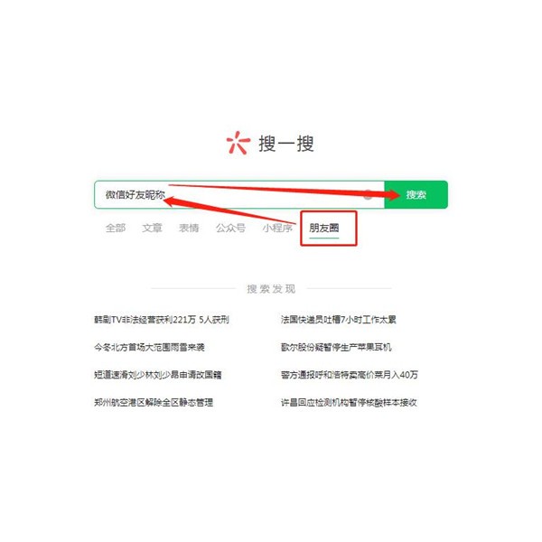 2.進(jìn)入到搜一搜頁(yè)面后,搜索輸入框下方標(biāo)簽點(diǎn)擊朋友圈,然后再輸入框內(nèi)輸入微信好友的昵稱或想搜的朋友圈內(nèi)容 然后點(diǎn)擊搜索。