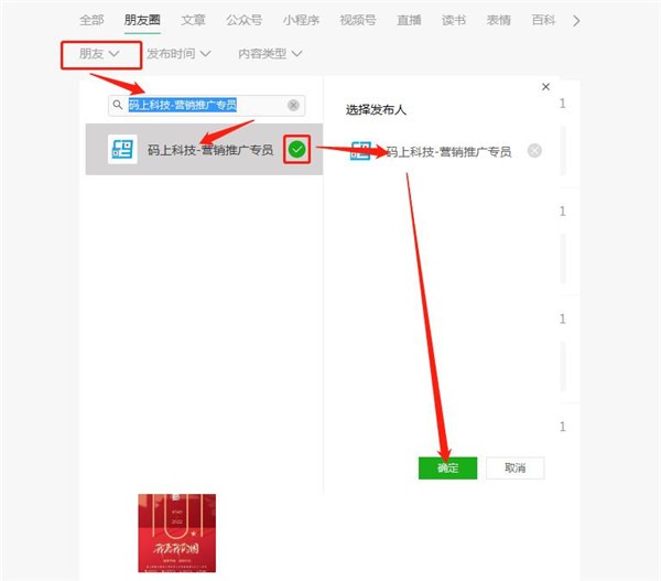 3.如果想搜索某個(gè)好友的朋友圈就再下方朋友的標(biāo)簽中進(jìn)行輸入篩選,搜索出想要看的好友之后選擇上發(fā)布人,點(diǎn)擊確定即可搜索到該好友發(fā)的朋友圈內(nèi)容。