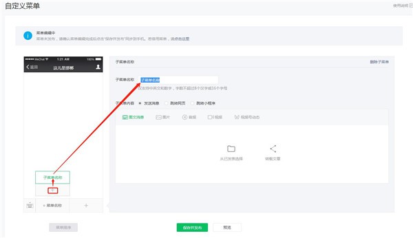 設(shè)置完成后,點擊保存并發(fā)布即設(shè)置完成,這時候你的公眾號底部就有自定義菜單啦,有時候剛保存上之后菜單不一定馬上就能出來,可能會有緩存,如果多點幾下還不出來那么取關(guān)下再重新關(guān)注即可。