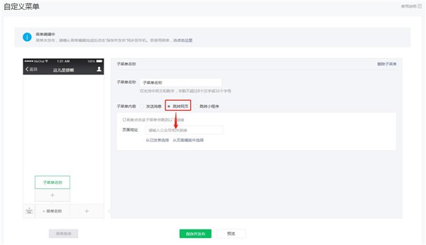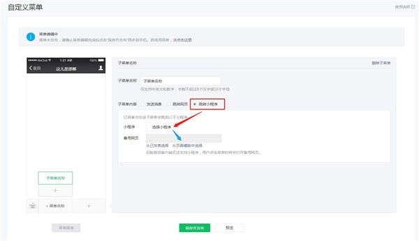 7.如果需要點擊跳轉(zhuǎn)到小程序,那就選擇第三個跳轉(zhuǎn)小程序,然后在下面選擇上關(guān)聯(lián)著公眾號的小程序,這里需要注意,小程序要和公眾號關(guān)聯(lián)才可以。(在左側(cè)標(biāo)簽小程序管理內(nèi)進行關(guān)聯(lián))