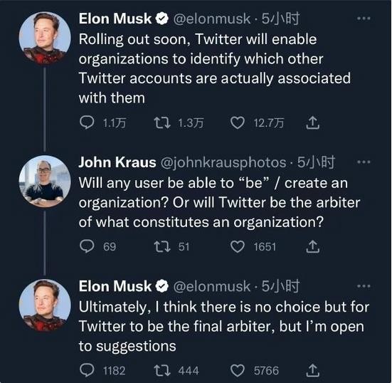 馬斯克稱:“很快就會推出。Twitter 將會允許組織機(jī)構(gòu)認(rèn)證與它們真正有關(guān)聯(lián)的其它 Twitter 賬戶。”