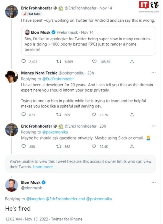 馬斯克和 Frohnhoefer 之間的對(duì)話很混亂,Twitter 的設(shè)計(jì)也讓人不太好理清這些對(duì)話。馬斯克在其中一條回復(fù)中問(wèn) Frohnhoefer,他個(gè)人做了什么來(lái)解決 Twitter 在安卓系統(tǒng)上速度慢的問(wèn)題。事情的最后,有一位網(wǎng)友說(shuō),F(xiàn)rohnhoefer 應(yīng)該在私下給他的老板糾正錯(cuò)誤,而不是公共平臺(tái)上,F(xiàn)rohnhoefer 則非常硬氣地回復(fù)稱也許馬斯克也應(yīng)該在私下提出問(wèn)題,最后馬斯克回復(fù)說(shuō):“他被解雇了。”