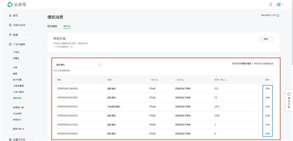 4.比如我們需要退款通知,在搜索框中輸入退款通知,就可以搜索出退款的模板消息,點(diǎn)擊后面詳情進(jìn)入查看哪個是自己需要的。