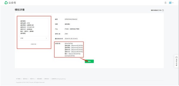 5.點(diǎn)詳情進(jìn)入后我們就可以看到模板的實(shí)例和詳細(xì)內(nèi)容,點(diǎn)擊添加就會到模板消息列表里。