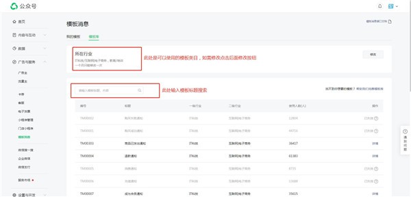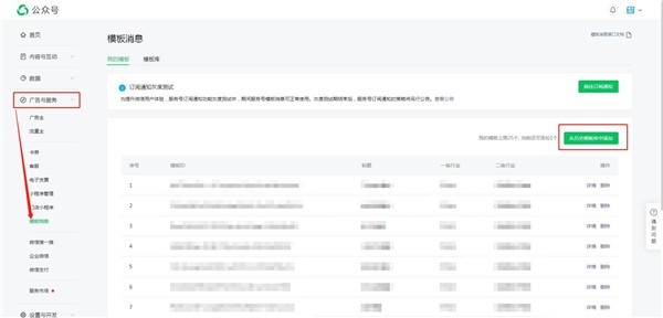 2.在左側(cè)菜單中找到廣告與服務(wù)--模板消息,點(diǎn)擊進(jìn)入后就可以看到右側(cè)的添加消息按鈕了。此處要注意,不同的類目可以添加的模板消息也不同,首先要給公眾號添加上相應(yīng)的類目。
