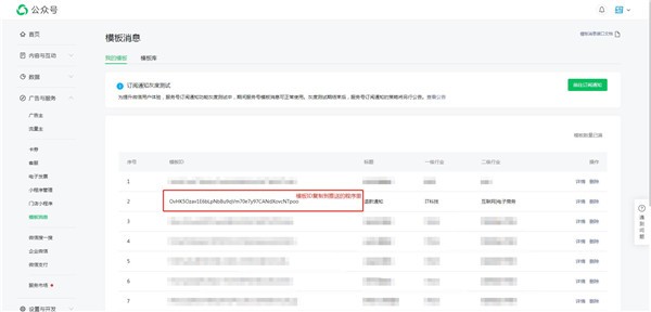 6.我們回到模板消息列表就可以看到添加的這條模板消息,復(fù)制模板ID到推送消息的程序里即可。