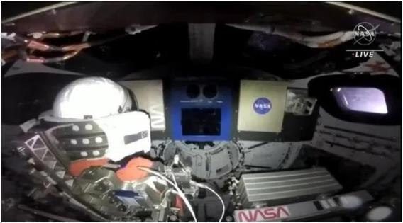獵戶座在升空約 2 小時后脫離火箭,宇宙飛船內外配備 16 個鏡頭,以便從不同的角度拍攝繞月飛行任務。圖片顯示,升空 9 小時后鏡頭拍到獵戶座一角及部分地球圖像,并有假人指令長坎波斯(Moonikin Campos)坐在艙內的照片。假人以 NASA 已故工程師坎波斯命名,他是當年把“阿波羅 13 號”宇航員安全送返地球的功臣之一。