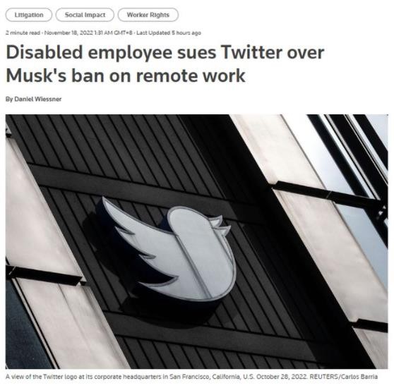 據(jù)路透社,一項(xiàng)新的訴訟聲稱,Twitter 公司老板馬斯克要求員工停止遠(yuǎn)程工作,并在“高強(qiáng)度下長(zhǎng)時(shí)間工作”,是對(duì)殘疾工人的歧視。