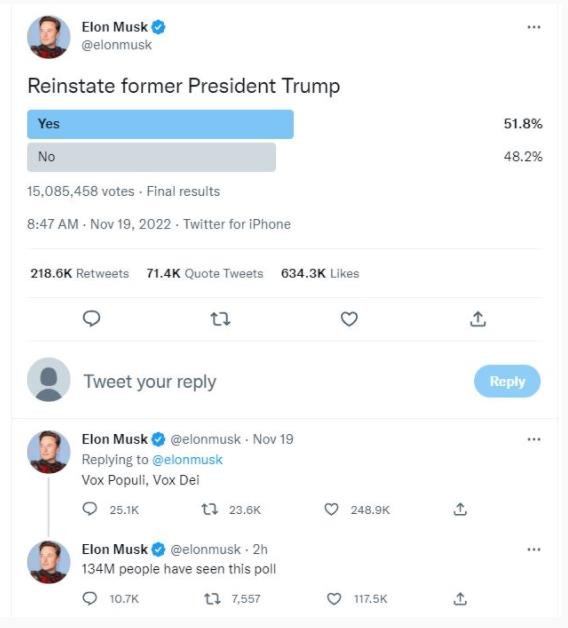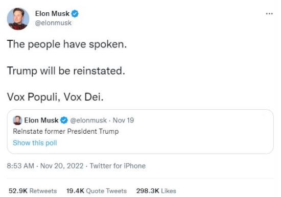 在得到這一結(jié)果后,馬斯克發(fā)布消息,稱自己將根據(jù)網(wǎng)民們的意愿解封特朗普的個(gè)人賬號(hào),他還用一句拉丁語(yǔ)格言表達(dá)了自己對(duì)這一決定的看法:Vox Populi, Vox Dei.(意為“人民的聲音就如同神的旨意”)。