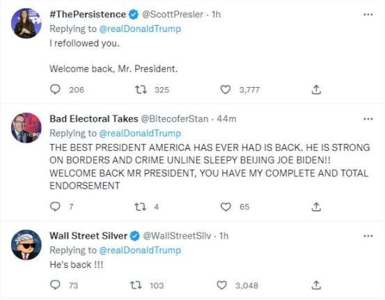 據(jù)筆者查詢,截至發(fā)稿時(shí),特朗普的個(gè)人賬號(hào)已經(jīng)恢復(fù)了正常展示的狀態(tài),且已允許用戶轉(zhuǎn)發(fā)和評(píng)論,不少特朗普的支持者已經(jīng)在評(píng)論區(qū)留言“歡迎回來(lái)”。