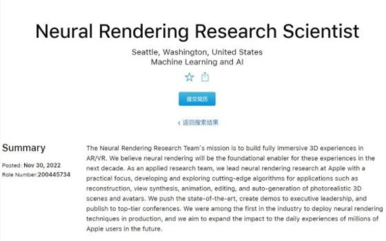 據(jù)蘋(píng)果官網(wǎng)顯示,其位于西雅圖的神經(jīng)渲染研究團(tuán)隊(duì)正在招募一位神經(jīng)渲染研究科學(xué)家。
