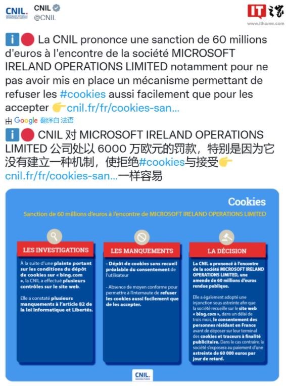 法國國家數(shù)據(jù)保護委員會 (CNIL) 周四表示,已對微軟愛爾蘭公司處以 6000 萬歐元(約 4.45 億元人民幣)罰款,因為該公司沒有建立一種機制,讓人們像接受 Cookie 一樣容易地拒絕 Cookie。