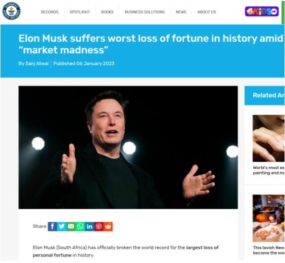 吉尼斯世界紀錄官方宣布,埃隆?馬斯克(南非)正式打破了歷史上最大的個人財富損失世界紀錄。