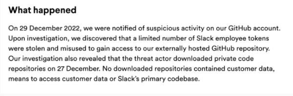2022 年 12 月 29 日,我們被告知我們的 GitHub 賬戶上有可疑活動。經(jīng)調(diào)查,我們發(fā)現(xiàn)數(shù)量有限的 Slack 員工令牌被盜,并被濫用于訪問我們外部托管的 GitHub 倉庫。我們的調(diào)查還顯示,黑客在 12 月 27 日下載了私有代碼庫。下載的倉庫沒有包含客戶數(shù)據(jù)、訪問客戶數(shù)據(jù)的手段或 Slack 的主要代碼庫。